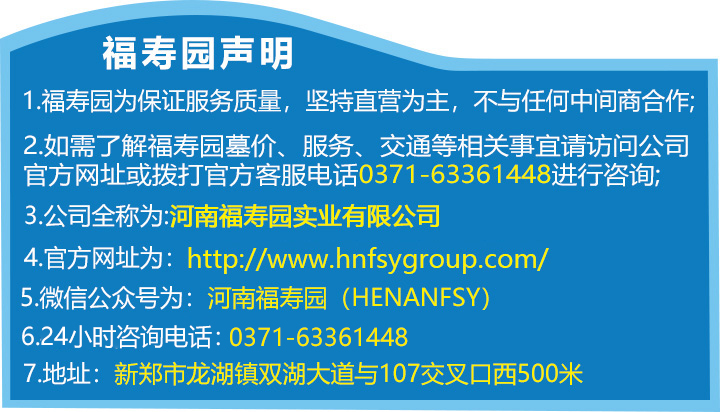 河南福寿园于2005年经省、市民政部门批准建设,2008年加入福寿园国际集团(01448.HK),园区位于新郑市龙湖镇,占地面积500亩,清幽静谧的自然环境与人文景观,在喧器的城市之外自成一片净士。园区距离郑州市区10公里,乘坐郑州地铁城郊线双湖大道站下车,向西直行300米即可到达,让思念不再遥远。 园区有文大师柏杨、军旅作家魏巍、豫剧大师马金凤、著名作家马新朝、雕塑家吴树华、豫剧名家吴碧波、戏剧理论家马紫晨等文化艺术界人士;有余品轩、张化一、吕迎春、王清贤、李杰、靳钟、程国璠等革命先辈;...